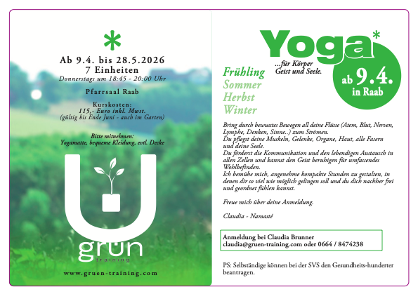 7 Donnerstage ab 9.4.2026 bis 28.5.2026 18:45 und 11.12. 18:45 bis 20:00 im Pfarrsaal Raab – einzulösen bis Ende Juni in anderen Kursen und